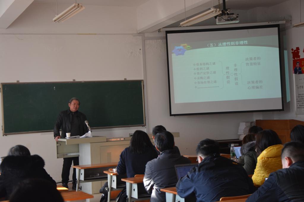 12月20日,华中科技大学张兆国教授应会计学院邀请,在阳光校区作了题为“现代财务理论的研究路径”专题讲座,会计学院全体教师聆听了讲座,讲座由会计学院副院长祝建军主持。