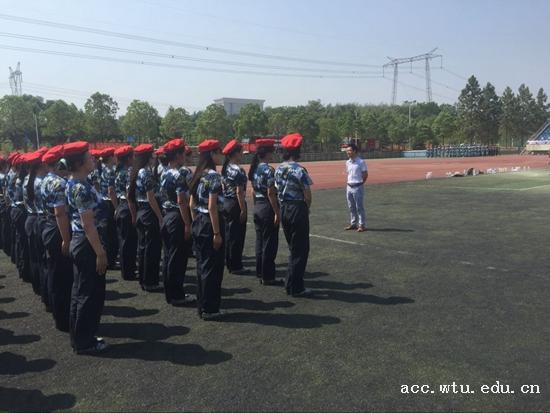 在运动场,同学们正在进行队列练习,闷热的天气丝毫没有降低同学们军训的热情与专注。他们神情坚定,毫不懈怠,无论是整齐划一的齐步正步,还是花样层出的造型表演排练,都展现了我院2016级新生良好的军人风貌和钢铁意志。